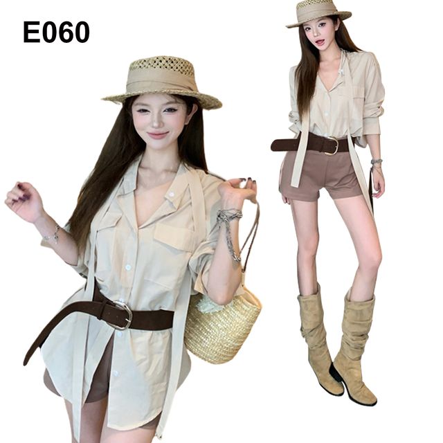 這款襯衫以其獨特的探險家風格設計,完美融合了率性與優雅。V領設計展現鎖骨線條,修飾臉型。襯衫裙採用輕薄透氣的材質,親膚舒適,非常適合夏季穿著。腰部搭配寬版皮帶,不僅勾勒出纖細腰身,更增添了整體造型的層次感與時尚度。下擺採用不規則剪裁,行走間充滿飄逸感,搭配同色系短褲,加上長靴,打造出兼具野性與知性的時尚風範。無論是日常約會,還是戶外探險,都能讓你成為焦點。