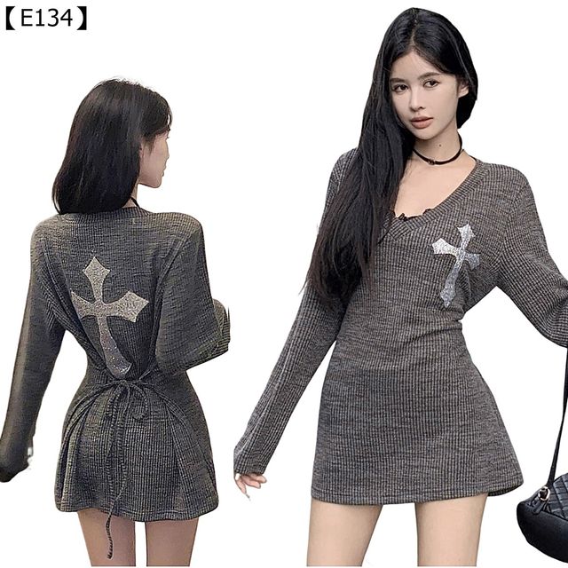 厭倦了普通到不行的基本款?這件**「辣妹戰袍」絕對是妳衣櫃裡最不平凡的存在!它完美融合了微叛逆的暗黑哥德風與火辣的** Y2K 甜心感。正面簡潔的深 V 領已經夠吸睛,但真正的亮點在背後!閃鑽大十字架在背後閃耀,搭配可調節的綁帶設計,讓妳能隨心所欲地勒出令人稱羨的小蠻腰。針織的紋理讓整體看起來高級又顯瘦,單穿或內搭都超有型。別再當路人甲,穿上它,妳就是街頭最閃耀的焦點!