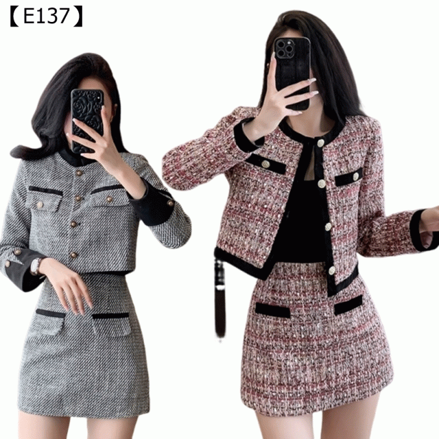 厭倦了只有正式感的小香風嗎? 這套**「甜辣千金」粗花呢套裝將經典與活潑完美融合!我們特別選用甜美感的粉色/知性感的灰色粗花呢**,並大膽運用對比撞色滾邊,讓整體風格瞬間年輕5歲!短版外套精巧利落,搭配高腰A字短裙的設計,不僅能修飾身形,更能巧妙地展現您的好比例,穿上它就是行走的氛圍感美女。這可不是一套只能鎖在衣櫃裡等正式場合的衣服,它就是為你的週末約會、姊妹下午茶而生!