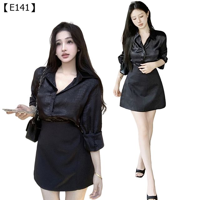厭倦了只有純黑的沉悶感嗎?這套**「甜酷光澤感」黑色套裝絕對是妳衣櫃裡最時髦的選擇!它不僅保留了黑色的修身顯瘦優勢,更加入了高調不低俗的絲光提花面料**,讓襯衫在每一次轉身時都閃耀著精緻的光澤。寬鬆慵懶的襯衫版型與利落的高腰A字短裙形成完美對比,既能藏肉,又極致顯腿長。無論是想展現街頭潮酷,還是輕熟性感,這套套裝都能讓妳一秒變身最有型的甜酷辣妹!