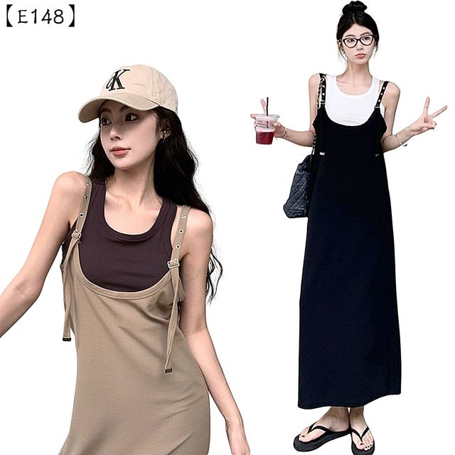 厭倦了每年夏天都差不多的碎花洋裝或T恤短褲嗎?來點不一樣的「甜酷系」炸街新選擇!💖 這款【E148】撞色工裝風吊帶長裙根本就是為追求「不費力的時尚 (Effortless Chic)」的你量身打造!它不僅擁有洋裝的慵懶浪漫,更融入了街頭工裝的個性細節——獨特的撞色組合和肩帶金屬鉚釘設計,讓你一秒從路人變身時尚焦點!