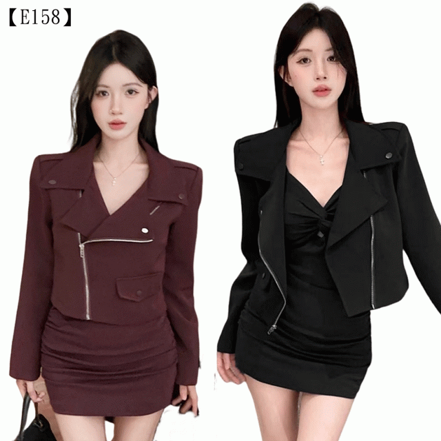 受夠了週末穿搭的選擇困難症嗎?這套為**「敢玩、敢秀、敢不同」的妳而設計的甜酷套裝**,絕對能一鍵解決妳的煩惱!它將個性鮮明的機車夾克元素融入剪裁精良的短版西裝外套中,保留了帥氣的斜拉鍊和肩章細節,但更強調修飾身型與提高腰線。內搭的褶皺包臀洋裝更是心機滿滿,恰到好處的抓皺設計,完美地修飾了腹部線條,讓妳的曲線更加玲瓏有緻。這不只是一套衣服,它是一件專為妳的**「精彩生活」準備的戰袍,讓妳無論是週末跑趴、參加Party、還是跟姊妹們拍照打卡,都能散發出自信、時髦、又充滿活力**的獨特魅力!