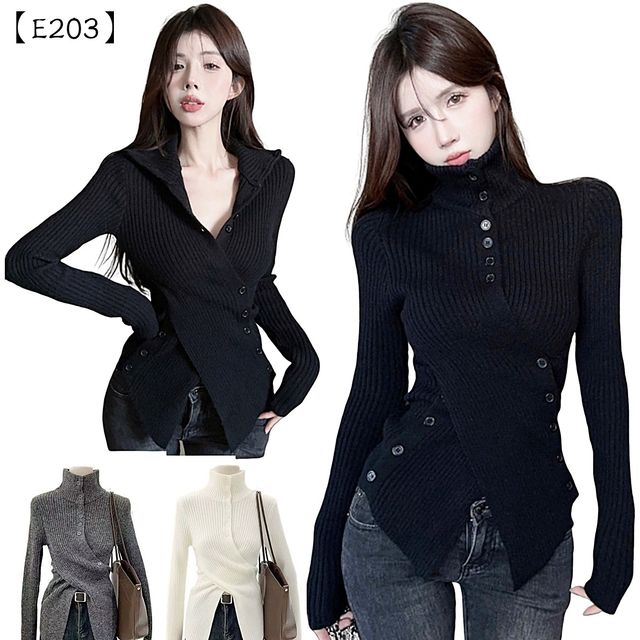 這件不只是件保暖的針織衫,它根本就是一件設計師款的藝術品!最大的亮點就是那個超有態度的不規則斜向排釦和下擺。它完美地打破了傳統上衣的對稱感,讓妳的穿搭瞬間變得與眾不同!