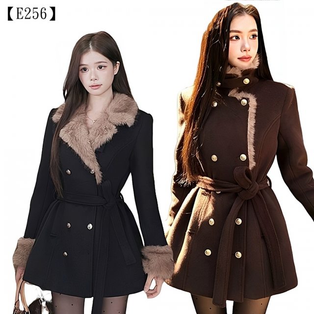 💡 最特別的設計點: 它的版型是收腰後自然散開的A字裙襬,搭配可調整的腰帶,就像穿了一件短版洋裝一樣,超級甜美!尤其是在毛絨領口和袖口的襯托下,整體造型既有歐洲名媛的精緻感,又不失女孩的活潑俏皮。