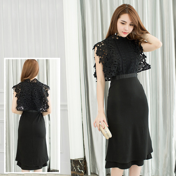 蕾絲拼接收腰中長連身裙 商品編號:107