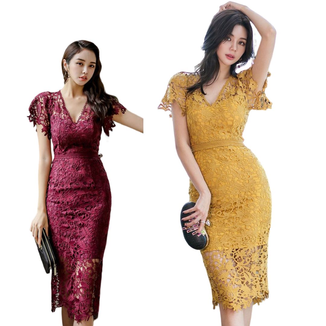 氣質V領修身包臀蕾絲連身裙 編號:A377
