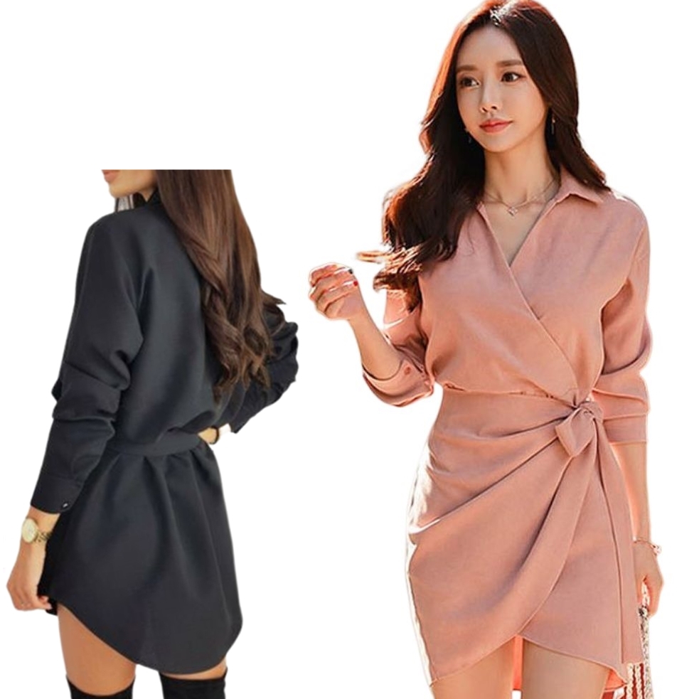 時尚長袖V領繫帶修身連身裙 編號:A659
