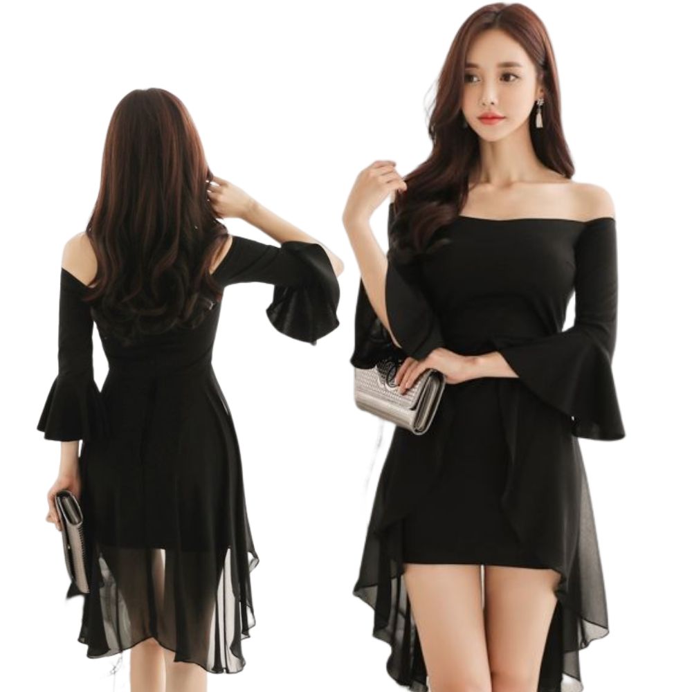時尚雪紡一字領喇叭袖連身裙 編號:A678