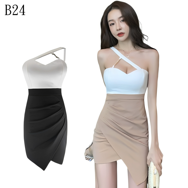想要在派對或夜店一出場就驚豔全場?這款 B24 洋裝就是你的不二之選!獨特的斜肩剪裁加上質感金屬鍊條,性感中帶點個性酷勁。裙擺的抓皺設計更是藏肉小心機,搭配包臀剪裁,完美展現你的身材優勢。今晚,你就是最閃耀的那顆星!