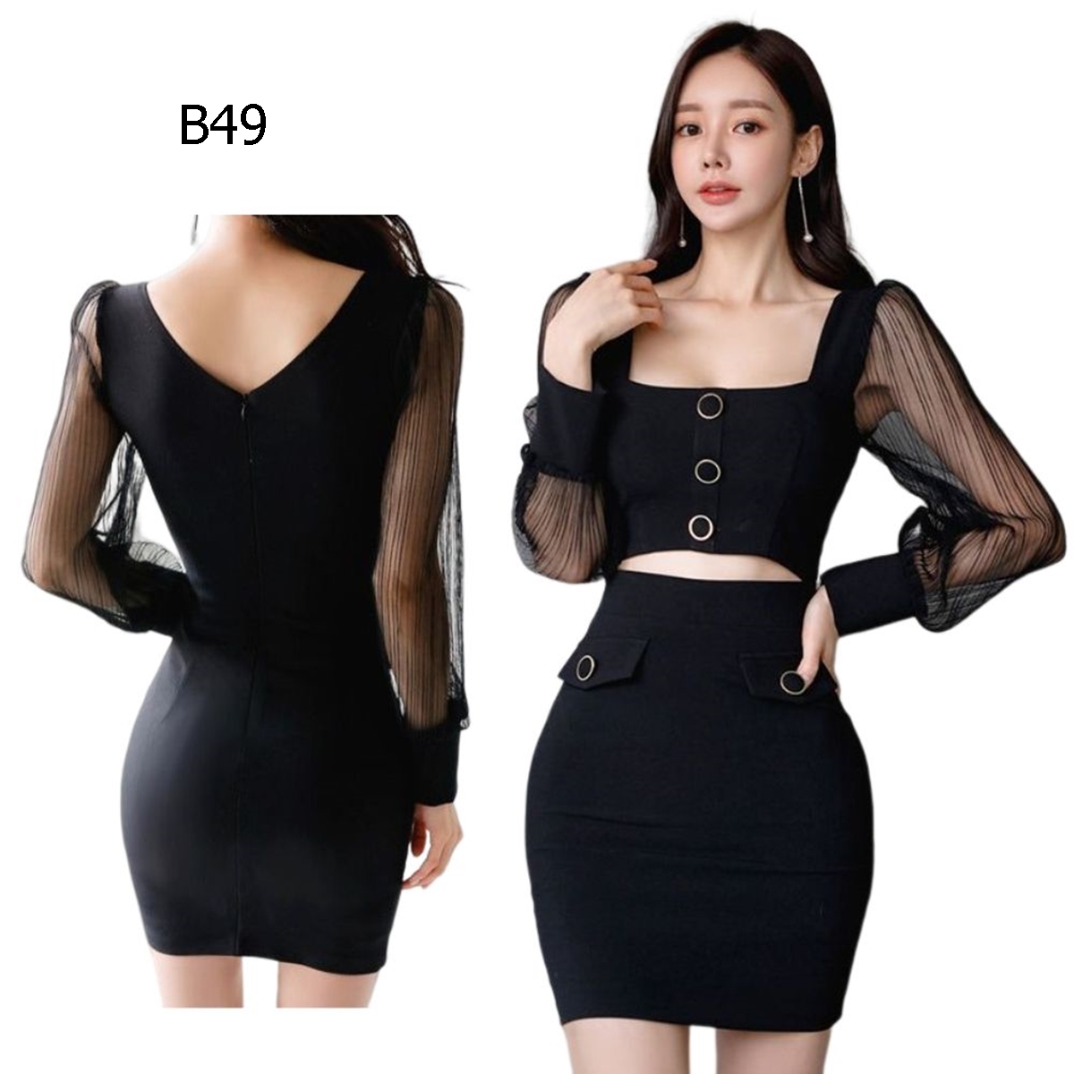 氣質名媛方領露腰泡泡袖修身包臀連身裙 編號:B49