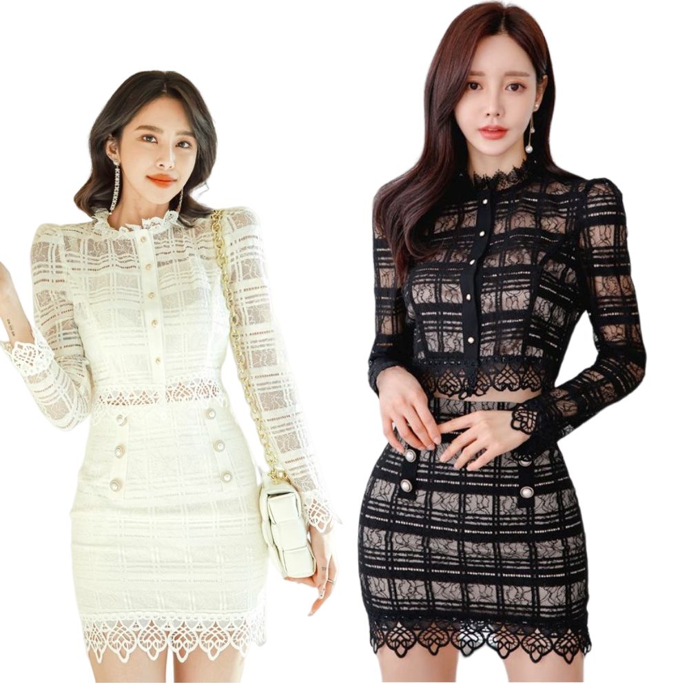 氣質蕾絲立領單排扣短款上衣+包臀裙兩件套 編號:B76