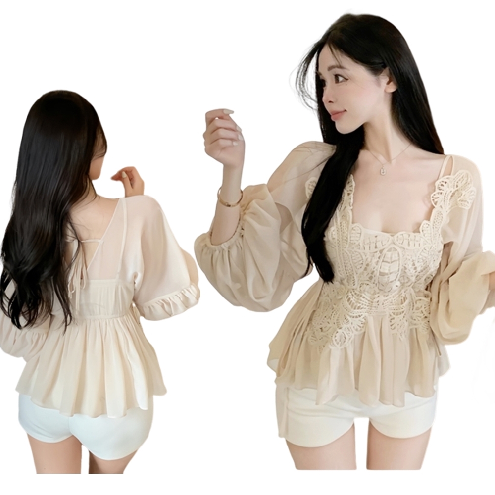 露背繫帶方領雪紡上衣+吊帶背心+短褲 編號:B447