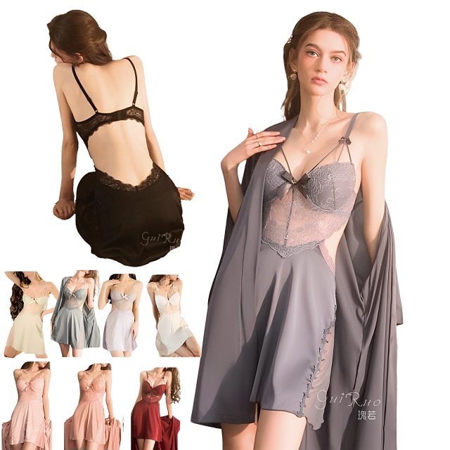 性感聚攏睡衣胸墊蕾絲露背吊帶裙 編號:C55