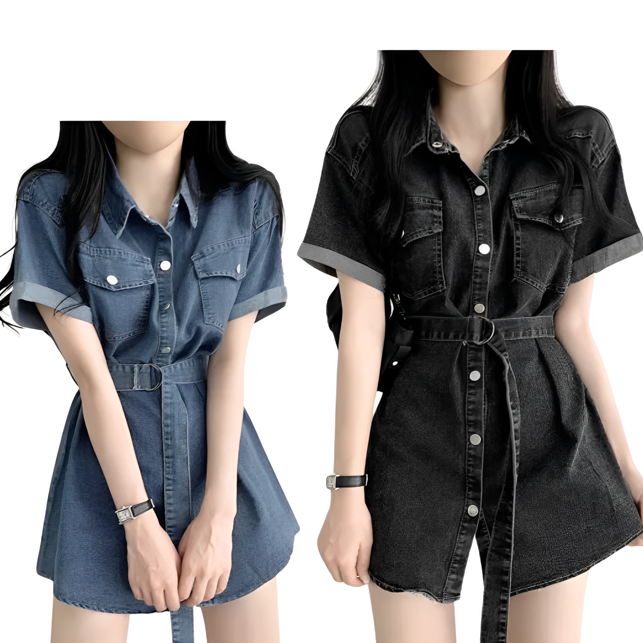 翻領單排扣牛仔連衣裙附腰帶 編號:C88
