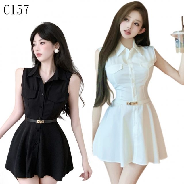 夏日街頭最亮眼的存在! 這款C157無袖襯衫洋裝簡直是「顯瘦界的愛馬仕」。俐落的翻領設計,穿出帥氣又知性的味道;最厲害的是那魔法般的收腰與A字裙擺,一秒修飾身形,視覺增高5公分!不論是率性的黑,還是仙氣的白,穿上它,妳就是那個自帶光芒的活力女孩。
