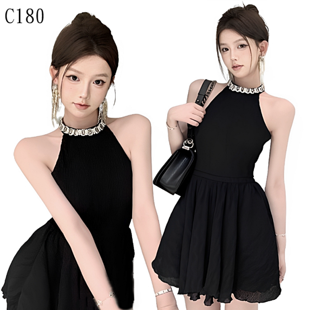 黑色掛脖無袖連衣裙 編號:C180