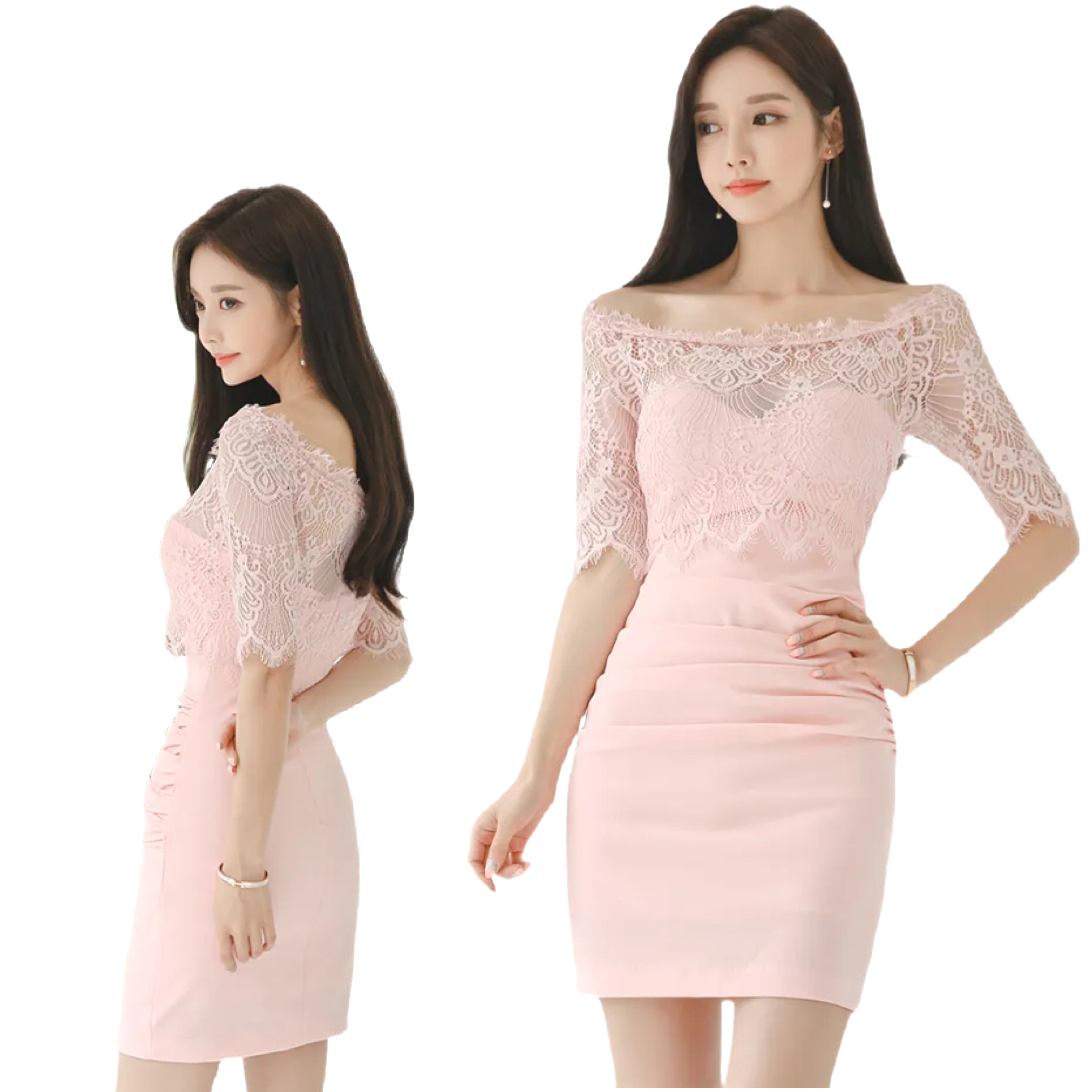 蕾絲拼接一字肩包臀洋裝編號:C255