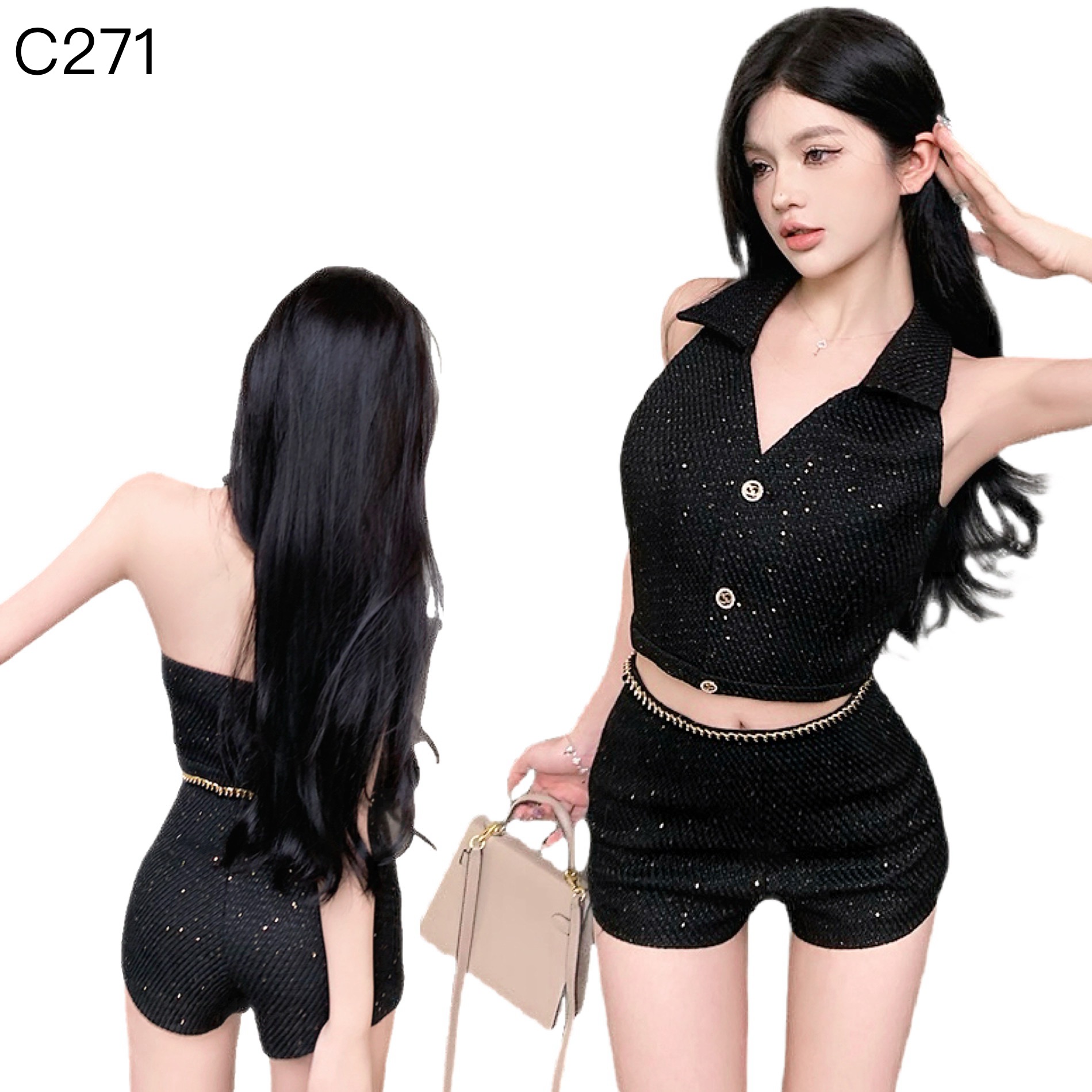 叛逆千金氣質小香風亮片掛脖V領背心辣妹短褲套裝編號:C271