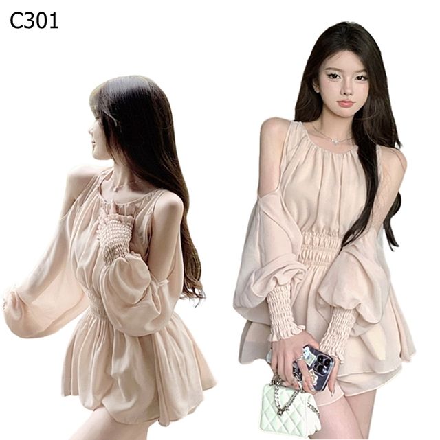 計感露肩泡泡袖收腰中長雪紡衫高腰短褲兩件套編號:C301