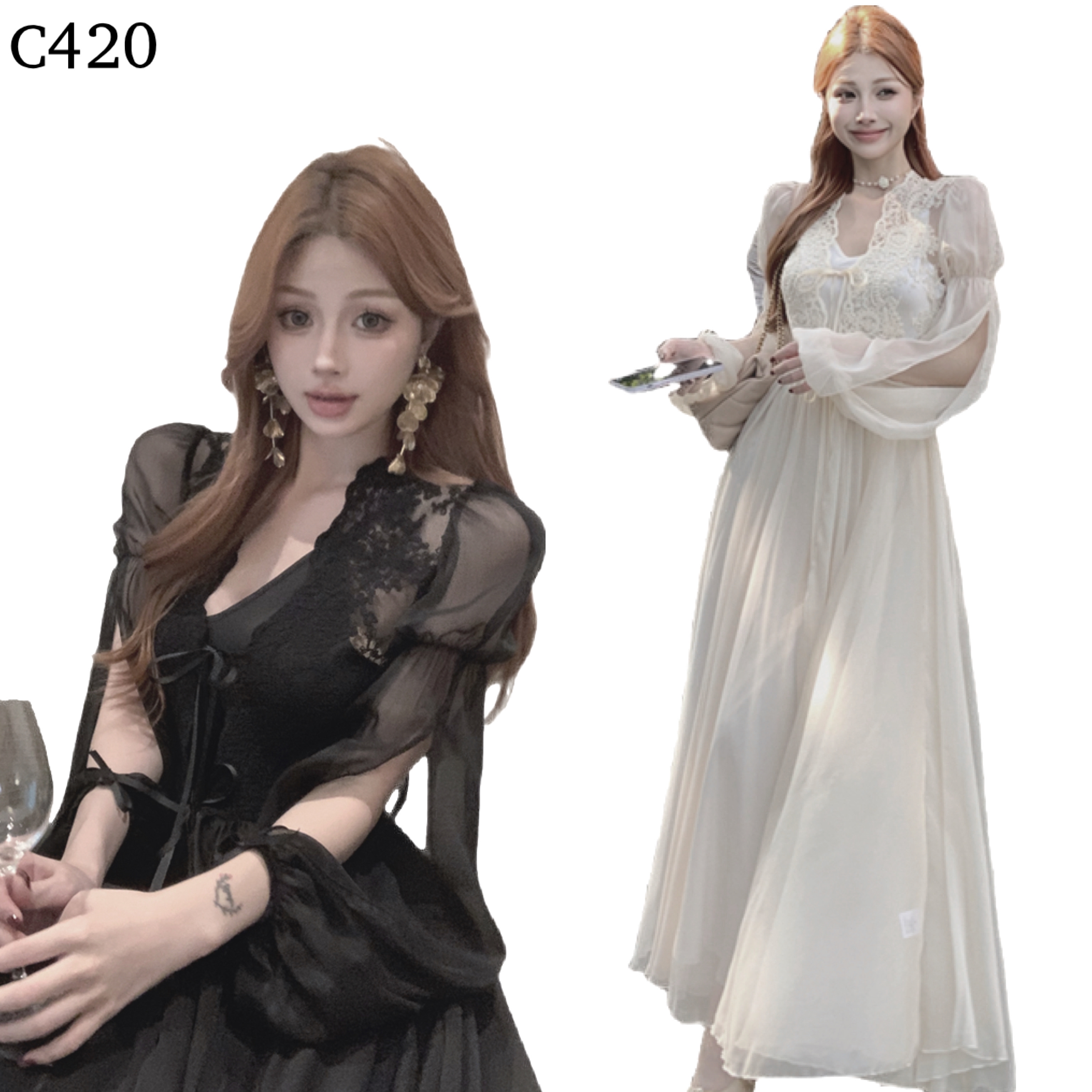 蕾絲繫帶連身長裙+吊帶裙 套裝編號:C420