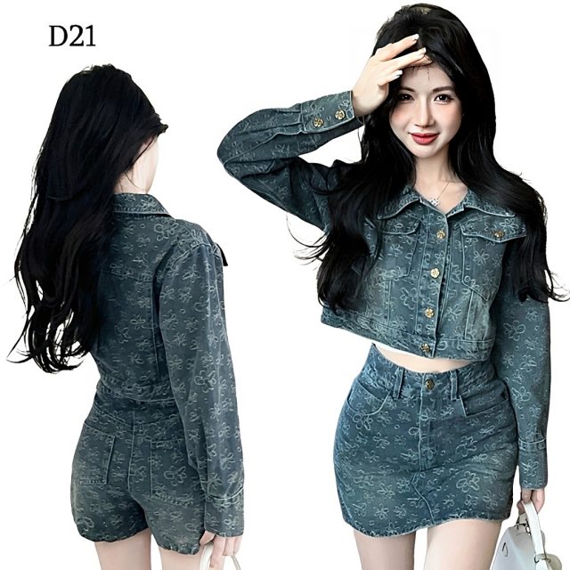 「D21 小雛菊印花牛仔套裝,讓你一秒變身韓系甜辣女孩!這款兩件式丹寧套裝採用復古石洗刷色,遍佈可愛的小雛菊或花朵圖案,完美擺脫一般牛仔的沉悶感,充滿青春活力。