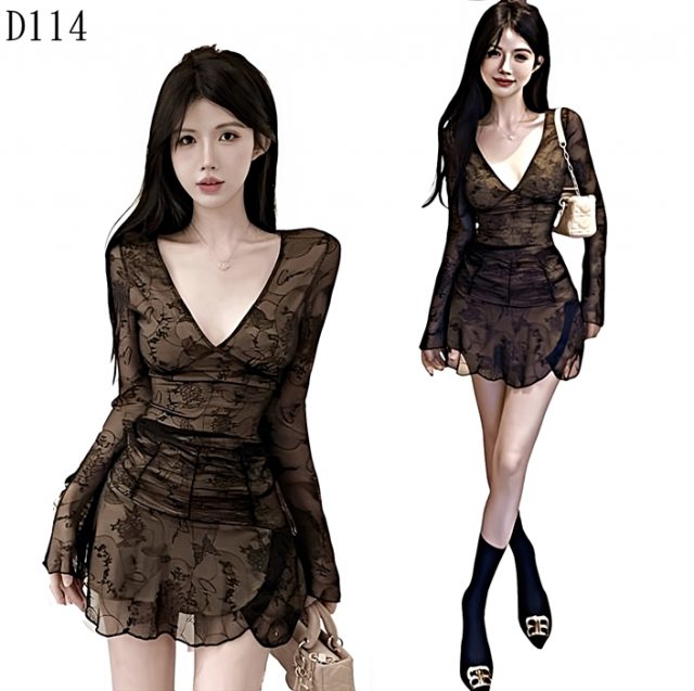 這款【D114】心機透膚套裝,是妳衣櫥裡不能缺少的神級單品!它將浪漫的花卉圖案印在輕盈的網紗上,並以V領蕾絲點綴上衣,打造若隱若現的迷人效果。高腰剪裁搭配飄逸的荷葉短裙,完美修飾身形,讓妳輕鬆擁有大長腿。這款兩件式套裝讓妳可以自由混搭,不論是參加派對、浪漫約會,或是姐妹淘聚餐,這套服裝都能讓妳成為全場焦點。快穿上它,釋放妳的甜美與自信,在每個場合都閃耀動人!