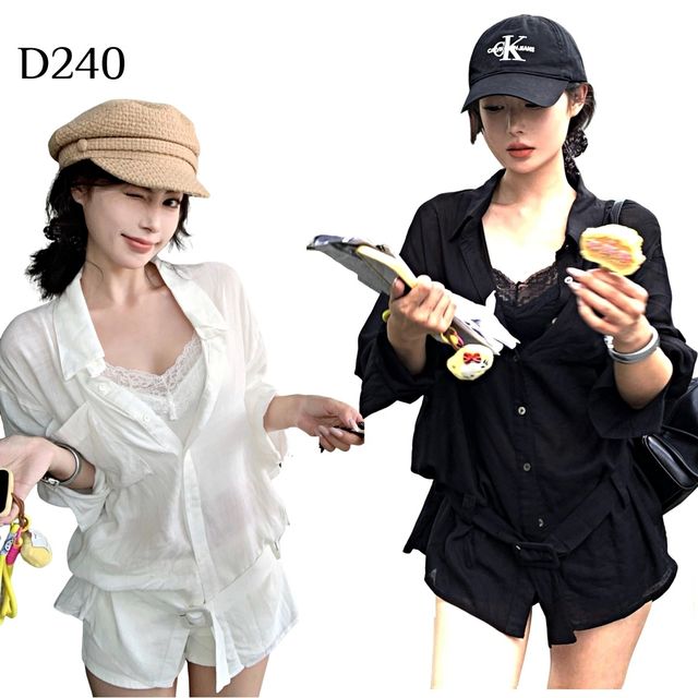 想要在夏天穿得涼爽又時尚嗎?這款D240慵懶風薄款襯衫+蕾絲背心套裝絕對是妳的衣櫃必備!輕薄透氣的襯衫材質,讓妳在炎熱天氣裡也能保持清爽,還能當作防曬外套,一舉兩得。內搭的心機蕾絲背心,展現甜美與性感兼具的魅力,讓妳的穿搭更有層次感。