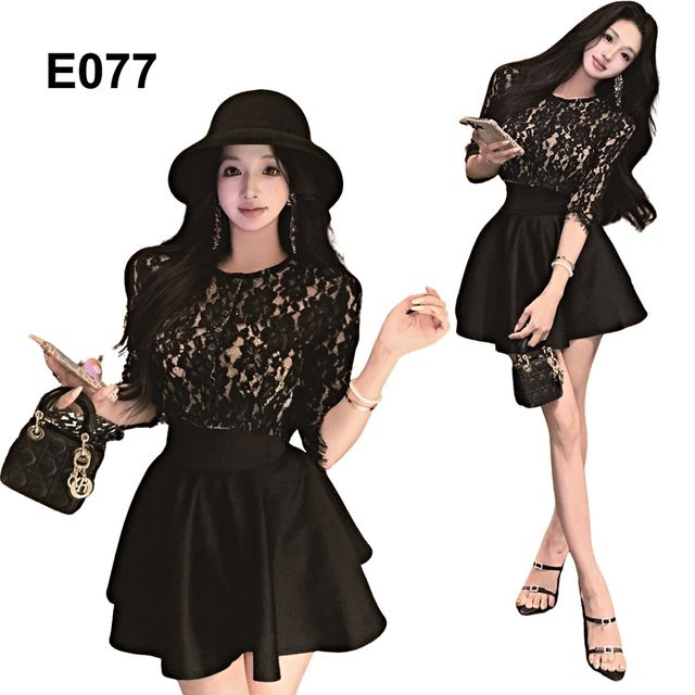 【商品介紹】 這款性感的蕾絲拼接縮腰洋裝是妳衣櫥裡不可或缺的百搭單品!上身採用精緻的透膚蕾絲面料,若隱若現地展現迷人曲線,性感又不失優雅。高腰的縮口剪裁,不僅能完美修飾腰線,更能拉長身形比例,讓妳看起來更高挑纖細。下身的傘狀裙襬設計,則巧妙地修飾腿部線條,讓妳輕鬆擁有大長腿。經典的黑色蕾絲,無論是出席派對、約會還是日常穿搭,都能讓妳充滿自信,展現獨特的魅力!